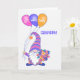Um cartão de boas vindas para seu avô, com um gnomo tradicional escandinavo, ou tomate, carregando três balões com as palavras, GET, BEM, LOGO neles e um bando de flores coloridas, em cores para combinar as roupas dos gnomos com os balões, azul, rosa e laranja. A palavra "GRANDPA!" está em azul correspondente. O gnomo tem um chapéu muito alto, listrado, com uma bobeira fofinha na ponta, para combinar as bolas em seus calçados azuis escuros. Ele tem uma barba branca grande, quase aos pés e roupas de bolinhas. O fundo branco é ligeiramente texturizado e a mensagem dentro é apenas uma sugestão de que você pode facilmente alterar ou excluir se desejar.