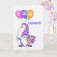 Um cartão de boas vindas para seu avô, com um gnomo tradicional escandinavo, ou tomate, carregando três balões com as palavras, GET, BEM, LOGO neles e um bando de flores coloridas, em cores para combinar as roupas dos gnomos com os balões, azul, rosa e laranja. A palavra "GRANDDAD!" está em azul correspondente. O gnomo tem um chapéu muito alto, listrado, com uma bobeira fofinha na ponta, para combinar as bolas em seus calçados azuis escuros. Ele tem uma barba branca grande, quase aos pés e roupas de bolinhas. O fundo branco é ligeiramente texturizado e a mensagem dentro é apenas uma sugestão de que você pode facilmente alterar ou excluir se desejar.