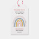 Tema bonito do arco-íris, etiqueta de presente de chá de fraldas com ilustração desenhada à mão de um arco-íris pastel com estrelas. O texto diz "obrigado-te por nos chutar com amor." Este design cor-de-rosa é perfeito para o chá de uma menina.