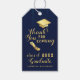 Crie etiquetas de agradecimento exclusivas em azul escuro e dourado para as lembrancinhas da festa de formatura. Este design elegante apresenta a mensagem de agradecimento pela presença, o nome do formando e o ano, decorado com ilustrações amarelo-dourado da capela e diploma do formando. Use o modelo para digitar o nome e o ano do formando.