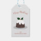 Tag de Natal Moderno Podim de Natal Moderno Podim de Natal personalizado e editável com uma etiqueta de Natal com fundo de cinza, texto vermelho e padrão de estrelas marrom de volta.