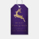 Etiquetas de presentes de Natal personalizadas e contemporâneas decoradas com renas de ouro no fundo de vidro roxo.