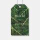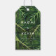 Um design ousado e fresco com palmeiras pintadas e borda falsa de ouro para um tema de verão e casamento tropical.