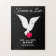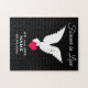 Este quebra-cabeça de quebra-cabeça do Forever in Love apresenta um belo carregando de pomba branca, um coração, e um texto personalizável que foi colocado contra um fundo preto. As três últimas linhas do item podem ser personalizadas com suas informações de casamento.