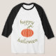 Feliz Camiseta de Halloween Pumpkin 3/4 Capa Raglan Baseball Style T-Shirt. Arte de abóbora laranja e pré-papoila com um caule verde encaracolado. Feliz texto de Halloween. Capas pretas.