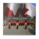 Desfile do Dia do Canadá com uma grande bandeira canadense ao fundo.
