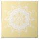 Esta mandala branca senta-se sobre um fundo amarelo claro. As cores são felizes e pacíficas. Parte da coleção Fenten Mandala.