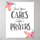 Design de tipografia com caligrafia e acentos florais de aquarela (canto superior esquerdo e inferior esquerdo), com palavras: "Transforme seus CARES em PRAYERS."