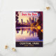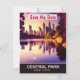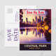 Convite de casamento do parque central com data de salvamento, cartão postal de viagem. Pôr do sol sobre o lago e os edifícios ao longe.