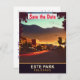 Convite de casamento com data de salvamento do Parque Este, cartão postal de viagem. Pôr do sol sobre a cidade e a montanha atrás.