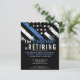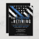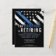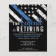 Este design apresenta uma bandeira da polícia com listras pretas e brancas, e uma fina faixa azul de linha também. O texto "A lenda está se aposentando" se senta acima de todos os detalhes partidários para os detalhes do polícia aposentado, xerife, capitão ou chefe do partido aposentado.