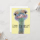 Mão branca e colorida ilustrada com avestruz sorridente com texto "Parabéns" sobre fundo amarelo pastel