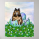 comemorar a Páscoa com este Tervuren belga a eclodir a partir de um ovo colorido, com tulipas coordenadas a crescer em todo o lado. Trabalho de arte de Danes-R-Us é perfeito para Páscoa ou qualquer época do ano!
