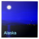 Moonrise na passagem de Dentro do casaco do Alasca. Montanhas à distância e um barco de pesca dirige-se para norte. A leitura de texto "Alaska" aparece em azul e branco brilhantes.