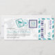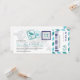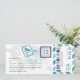 Um convite de bilhete inspirado em cartão de embarque com detalhes divertidos de carimbo de passaporte e listras de correio aéreo. Mostrado em tons de Aqua, Teal, Navy, Cinza Escuro e Cinza Claro. O verso inclui espaço extra para qualquer informação de hotel, viagem ou site.