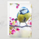 Papel de carta com uma fotografia espantosa do pequeno pássaro mais bonito empoleirado num galho coberto de flores cor-de-rosa e folhas verdes. O pássaro tem uma cabeça azul e corpo amarelo com um rosto muito doce. Adorável.