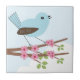Pássaro azul em um galho de árvore florescente rosa. Azulejo de cerâmica decorativa.