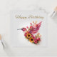 Um beija-flor voador coberto de girassóis, becos e tulipas cor-de-rosa Feliz Aniversário em dourado