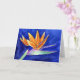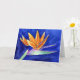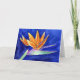 O fã vibrante, como a coroa de pétalas laranja de um pássaro de flor do paraíso, contrasta com o fundo azul real de pelúcia profunda. A pintura de flores de arte aquática apresenta uma visão de perfil do pássaro da flor do paraíso. Esta flor é conhecida como Flor de Crane na África do Sul. Personalize este cartão de saudação de flor do Paraíso ou cartões de nota com seu próprio texto e imagens usando o botão "Personalizar o Pássaro" para criar um presente especial de flor do Paraíso!