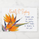 Nivelando pequenas garrafas com pássaros de flores do paraíso design. Laranja, flores havaianas decoram adesivos brancos. Adicione os nomes da noiva e do noivo em laranja no topo, com um lugar para uma mensagem curta de "obrigado você" aos hóspedes com letra azul escura impressa.