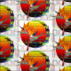 Pássaro da planta da flor de paraíso (Strelitzia) no por do sol geométrico. Projetado pelo Sequin sonha o estúdio.