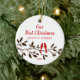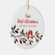 Nossa Primeira Ornação de Natal apresenta um par na moda de pássaros de amor vermelhos sentados em um galho marrom! Personalize com suas informações e data e você está pronto para ir! Um maravilhoso presente de guardiã para seu primeiro natal e um excelente para sua coleção de enfeites de natal.