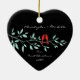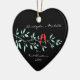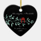 Nossos primeiros enfeites de natal caracterizam um par à moda de pássaros vermelhos do amor que sentam-se em um ramo & em um grupo azuis em um fundo preto! Personalize com sua informação e data e você são todos ajustam-se para ir! Presente datado maravilhoso da lembrança para seu primeiro Natal e uma grande adição a você coleção dos enfeites de natal.