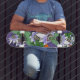 Ande com a beleza da natureza! Este skate apresenta uma ilustração ousada de flores apaixonadas com folhas verdes vibrantes e detalhes laranja sobre fundo roxo e verde. Um design que combina elegância botânica com estilo urbano — perfeito para skatistas que amam conselhos únicos e artísticos.