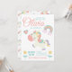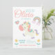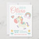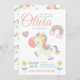 Convite de aniversário mágico do Unicórnio com corações, estrelas, flores e arco-íris em cores pastéis.