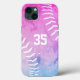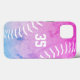 Esta capas de iphone de softball amorosa para meninas apresenta um softball minimalista (representado apenas pelos pontos da bola em branco) sobre um fundo de gradiente de aparência rosa a azul angustiado - personalize com seu número de camisa - por katz_d_zynes