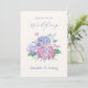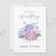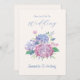Pastel Hydrangea Flowers Convite de Casamento projetado com aglomerados de Pastel Hydrangea Flowers em um fundo branco suave e texto azul. O texto inicial inclui: Por favor, junte-se a nós para o casamento, e os nomes da noiva e do noivo. O texto do lado inverso inclui: Nomes de Cheio da Noiva e do Groom, Data de Casamento, Hora, Local, Nome e Endereço do Local de Recepção e Informações de Recepção. Para personalizar, basta inserir seus detalhes em nosso modelo fácil, substituindo o texto de exemplo. Certifique-se de ver toda a Coleção de Casamentos de Pastel Hydrangea Flowers para material de papelaria e acessórios correspondentes.