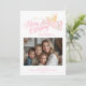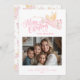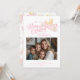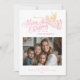 This Christmas card features an angel wearing a pink dress playing a horn with hand lettering that says "Merry Christmas. You can personalize with names and a year.