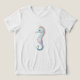 This watercolor illustration features a charming pastel seahorse with a soft curved silhouette and a gentle, friendly expression. Painted in calming shades of mint blue and lavender, the design highlights delicate textures, tiny speckles, and smooth gradients that create a dreamy underwater feel.