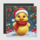 Um alegre patinho amarelo vestindo um chapéu de Papai Noel e um cachecol vermelho em meio a decorações festivas de Natal e neve vibrante caindo, capturando o espírito alegre e mágico das férias de inverno.