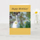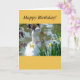 Um pato branco giro percorre a borda das águas cercado por bonito narcisos amarelos. Evocativo dos dias de Primavera e ensolarado à medida que o sol brilha na água do lago. Um cartão muito feliz e ensolarado adequado para um adorável aniversário para um amigo ou amado.