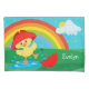 Celebre a chuva com esta linda esteira de pato feliz. A mala tem um pato amarelo alegre a saltar numa poça. O pato está vestindo um chapéu de bolinhas e tem um guarda-chuva vermelho. No céu há um belo arco-íris colorido, sol, nuvens e chuva. Personalize a pasta com o nome do seu filho.