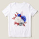 A striking patriotic floral composition featuring rich blue roses and soft ivory camellia-style blooms, layered with bold red botanical accents. The elegant contrast of red, white, and blue creates a dramatic Americana aesthetic, blending classic floral beauty with modern graphic depth.