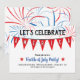 O vamos celebra a América grande e no topo. A América está em letras brancas na bandeira vermelha. Fogos de artifício no fundo, com detalhes de festas no fundo. O Partido 4 de julho está em azul, com uma estrela vermelha em ambos os lados.