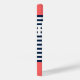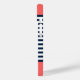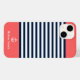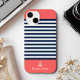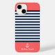 Personalize this cute Navy and White Striped Nautical Print Phone Case with your name on an Orange Background. The design features a modern white script typography on an Orange background. The example is for an iPhone 14 model, but it will fit other existing models on Zazzle. Please verify before purchasing.