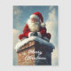 A imagem mostra o Papai Noel sentado no topo de uma chaminé de tijolos coberta de neve, vestido com seu icônico terno vermelho com acabamento de pelo branco e um chapéu vermelho. Ele está sorrindo calorosamente, com as mãos enluvadas entrelaçadas, enquanto a neve cai suavemente ao seu redor. O fundo apresenta um céu invernal suave com nuvens leves, realçando a atmosfera festiva e mágica da cena.