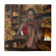 Excelente de Natal 3D. Bonito loira com os pés nus para cima e diante de você enquanto ela relaxa ao pé do fogo com uma árvore decorada.