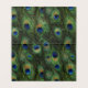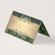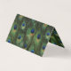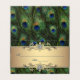 Cartões de lugar de casamento de pavão dobrado com lindo centro de joia dourada em um belo fundo de pena de pavão.