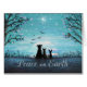 Paz na Terra Sunset de inverno e a dentro da carta diz: "Que comece no coração de amigos e familiares e se espalhe pelo mundo. Um Natal abençoado para você." Dois cachorros e uma silhueta de gatos assistindo o pôr do sol numa noite de inverno. Em cores azul, preto e branco. Com duas árvores de ambos os lados e pássaros voando em direção ao pôr do sol. Flocos de neve caindo e um casal de estrelas brilhantes no céu. Cenário de inverno Arte Original de Pintura Acrílica feita por Donna Leger para Designs de Ironia. Todos os Direitos Reservados