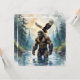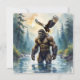 Cartão de vazio de pé-direito. Um Sasquatch muscular com uma águia pousando em seu ombro enquanto ele percorre um rio em uma floresta.