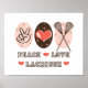 Um símbolo de paz, coração, bastões de lacrosse cruzados e uma bola em castanho-rosa e escuro cercada por estrelas e polariza pontos. Este design de Lacrosse, que é bonito e esportivo, faz um segundo grau de menina ou universitária ou uma liga de lacrosse feminina, fã de lacrosse, treinadora de lacrosse ou presente de lacrosse mãe. Projetado por Chrissy H. Studios, LLC.