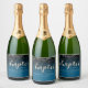 Acrescente sua marca pessoal ao seu dia especial com essas famosas etiquetas simples, mas na moda, de garrafas de vinho espumante, que apresentam elegantes manuscritos e em caracteres de bloco em pêssego com um chá de confete em uma sombra oceânica, preto a deslumbrante, de evocação azul do fundo mediterrânico. Personalizar conforme desejado. Design © W.H. Sim. Mais informações em zazzle.com/expressionsoccasions
