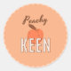 Texto de Peachy Keen, com imagem de pêssego Pêssego colorido adesivos redondos e bordas recortadas.