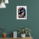 Poster mostrada com um impressão de arte de um bonito pavão, mostrada com um olhar branco de tapete falso. Personalize este item ou comprar como está. Imagem do stock