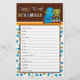 Descrição do design Um design original EXCLUSIVO disponível somente em MonkeyHutDesigns. Cartão de folha de jogos de chá de fraldas. Tema do Chá de fraldas Monstros Peek-a-Boo com padrões azuis, castanhos verdes e brochuras e faixas. Corresponde ao convite para chá de fraldas do MonkeyHutDesigns #063. BABY WORD SCRAMBLE - Divertido adição ao chá de fraldas...veja quem pode descodificar todas as 15 palavras relacionadas ao bebê corretamente primeiro! Uma chave de resposta está incluída. Para obter a chave da folha de jogo, entre em contato comigo em: MonkeyHutDesigns@gmail.com