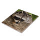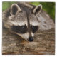 Azulejo cerâmico com fotografia de um guaxinim fofo e curioso descansando o rosto em um tronco de madeira. Adorável.